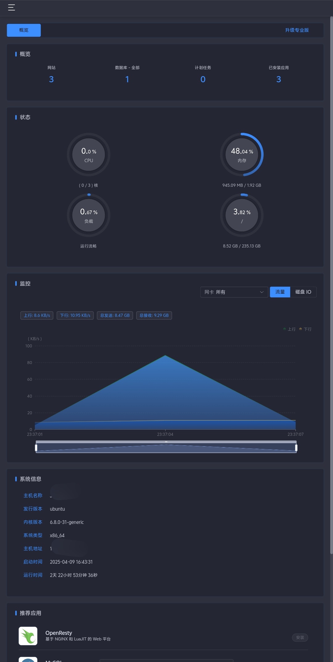 那么安装完成后,你就可以通过IP+端口的方式进入网站了。端口是啥在应用列表里、在你安装时会告诉你,你安装前也可以自定义端口,但还是推荐它默认的。