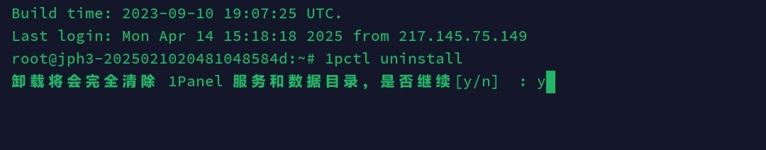 y和n分别代表Yes和No,输入y继续卸载。等待卸载完成即可,若你在1panel上搭建了重要的项目,记得要备份,以免造成损失。