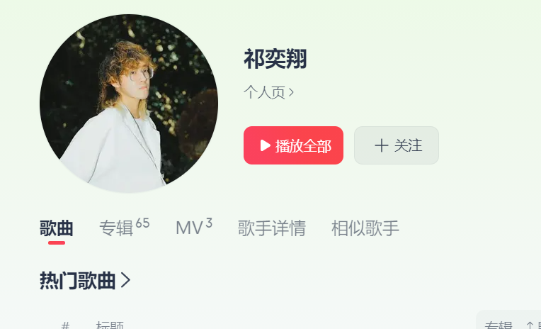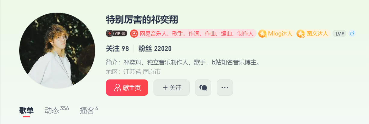 上图为祁奕翔在网易云音乐的歌手页和个人主页