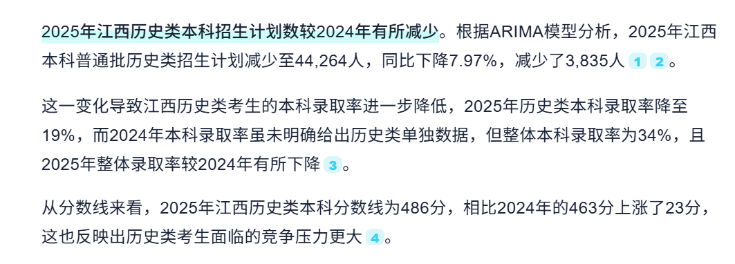 根据资料指出,江西历史类本科招生计划在2024年地人数为48,099,2025年下降至44264人,同比下降7.97%。